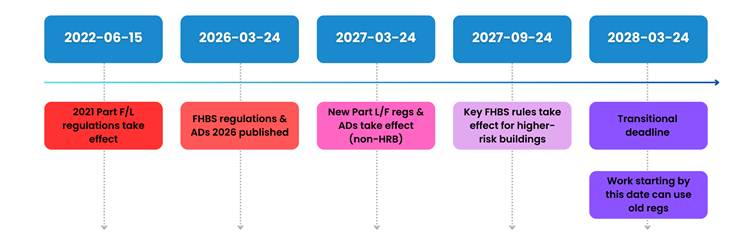 The new regulations come into force on 24 March 2027 for most building work, and 24 September 2027 for higher-risk buildings. Transitional arrangements allow some projects already in progress to follow previous standards, provided they begin before March 2028.
